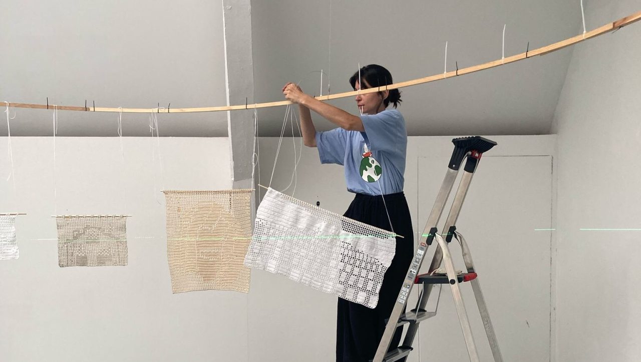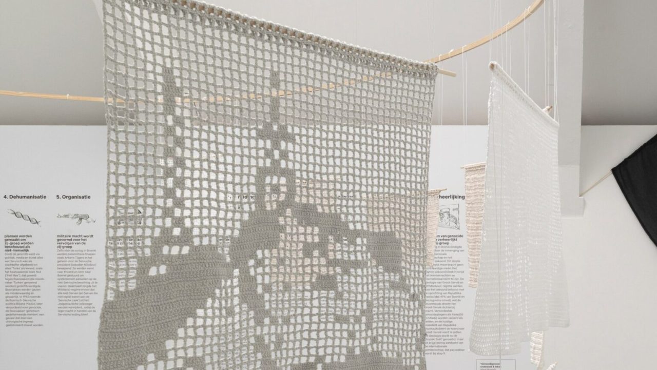 Karabašić postavlja svoju izložbu heklanih radova koja prikazuje faze genocida. Foto: Lulu Linders.