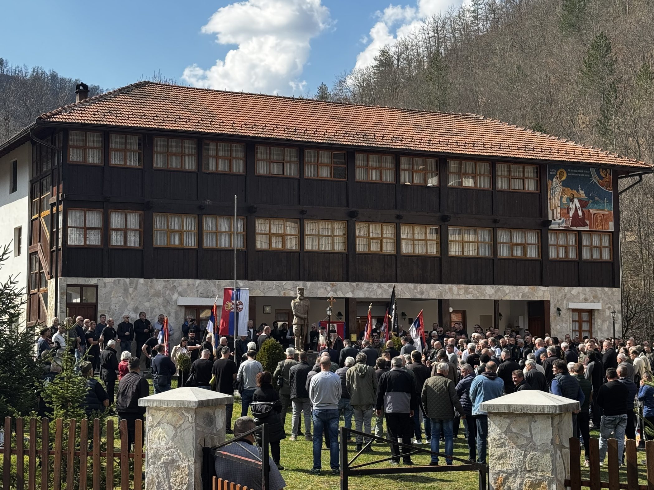 Ispred manastira su ljudi u grupama koji su, prema registarskim oznakama automobila, stigli iz različitih dijelova BiH i regiona. Među njima je i Neđo Marmat iz Omarske pored Prijedora koji kaže da je putovao šest sati u jednom pravcu kako bi odao počast Mihailoviću jer mu je “to i partija njegovog djeda“.