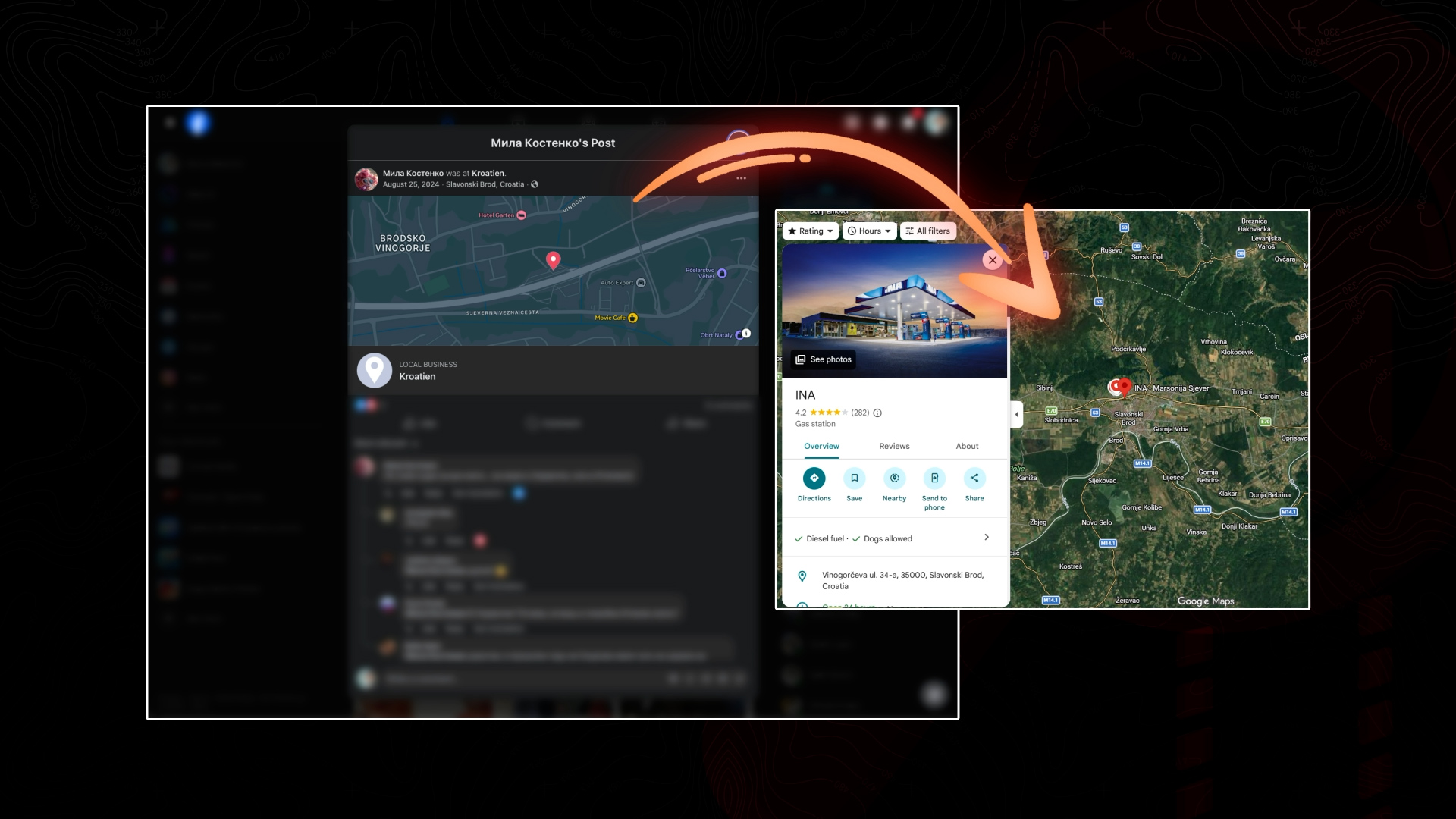 Ona se 25. augusta 2024. godine locirala na benzinskoj pumpi Ina u Hrvatskoj, nedaleko od Slavonskog Broda u pravcu Zagreba.